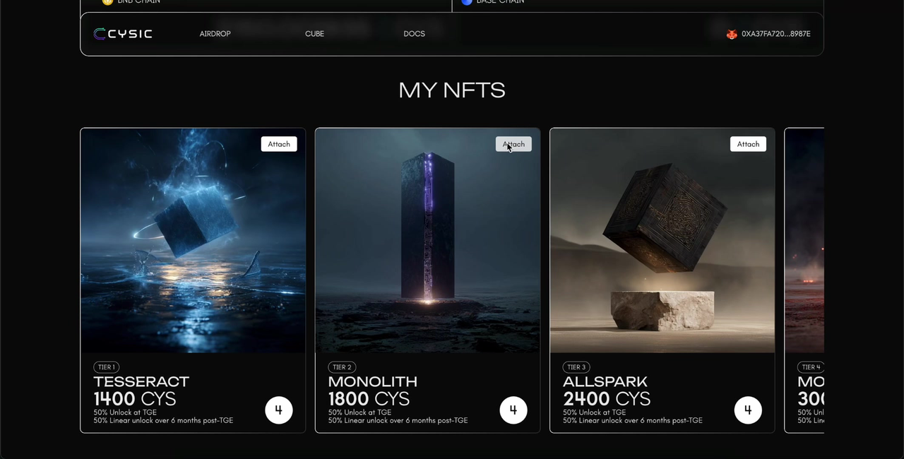 Go to https://cysicfoundation.org/userPortal and locate the MY NFTS section. You will see all your NFTs displayed as cards, organized by tier. Each card shows the NFT name, tier, and the number of NFTs you hold (shown in the bottom-right circle).Click the Attach button on any NFT card to begin.