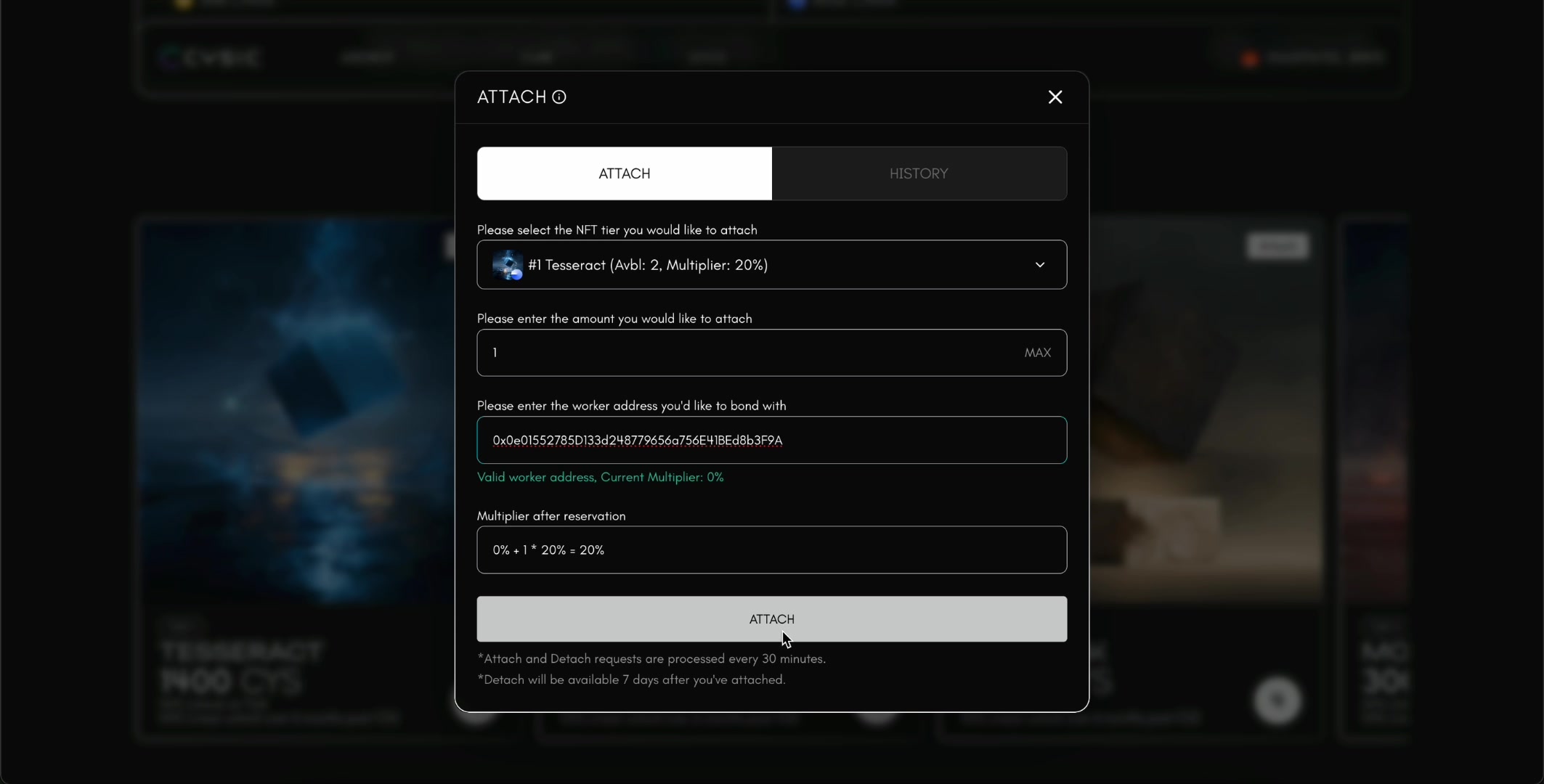 - Attach: Bond your NFT to a worker address. This applies a reward multiplier based on the NFT tier and quantity attached.