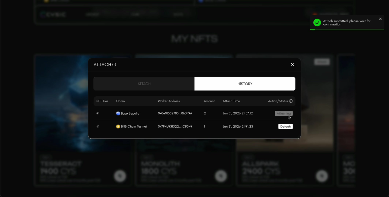 Q: Can I attach NFTs from different chains to the same worker? A: Yes. You can attach NFTs from both BNB Chain and Base Chain to the same worker address. Each attachment is tracked separately in the History tab.