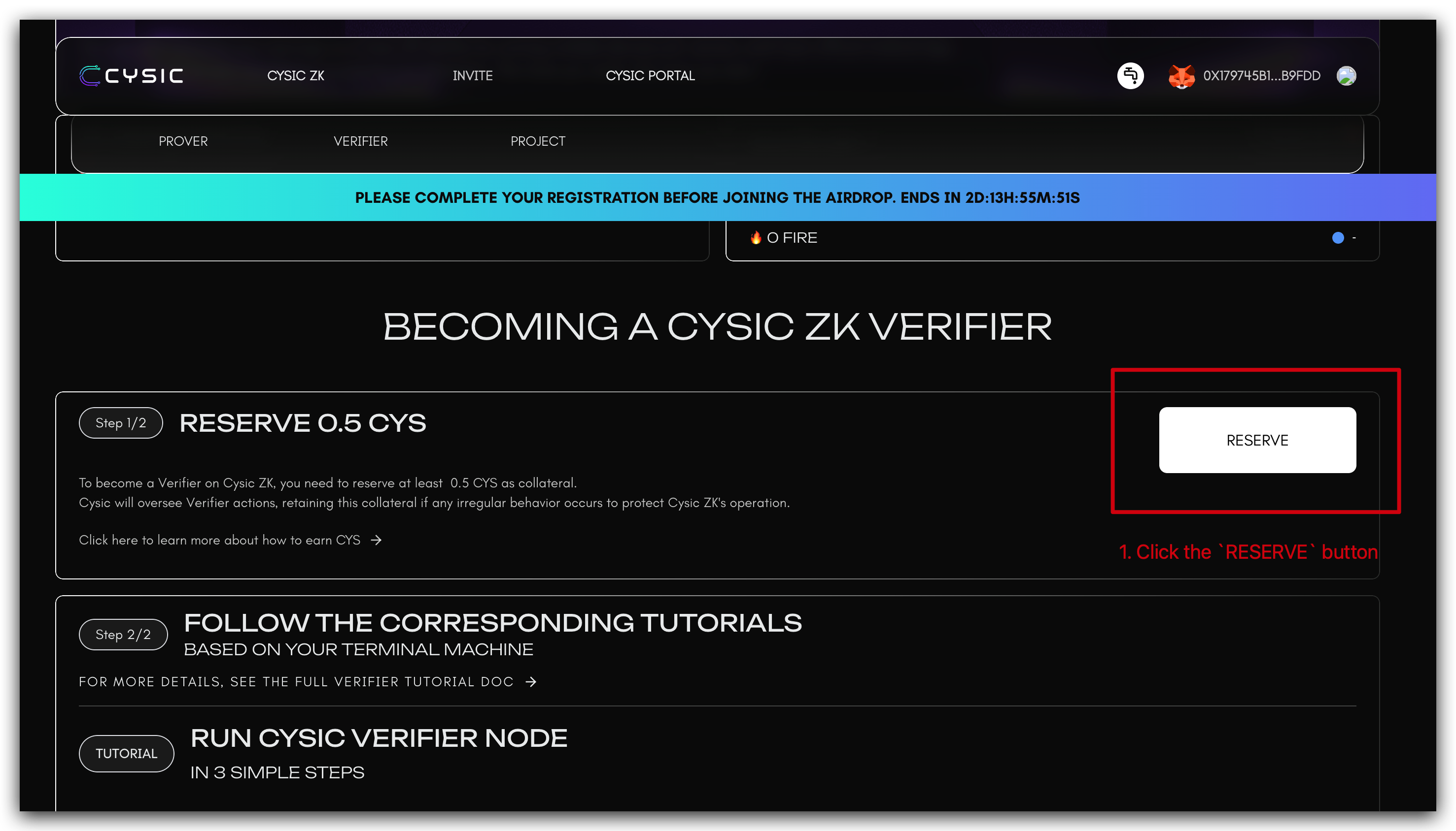 To activate your Verifier Node, follow these steps to reserve CYS tokens: